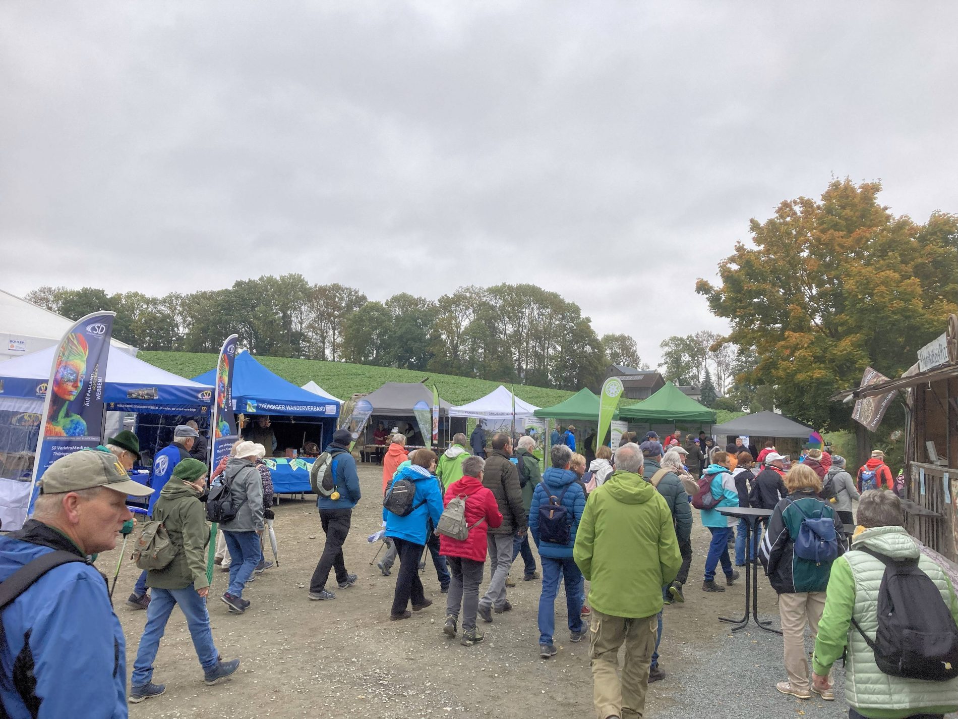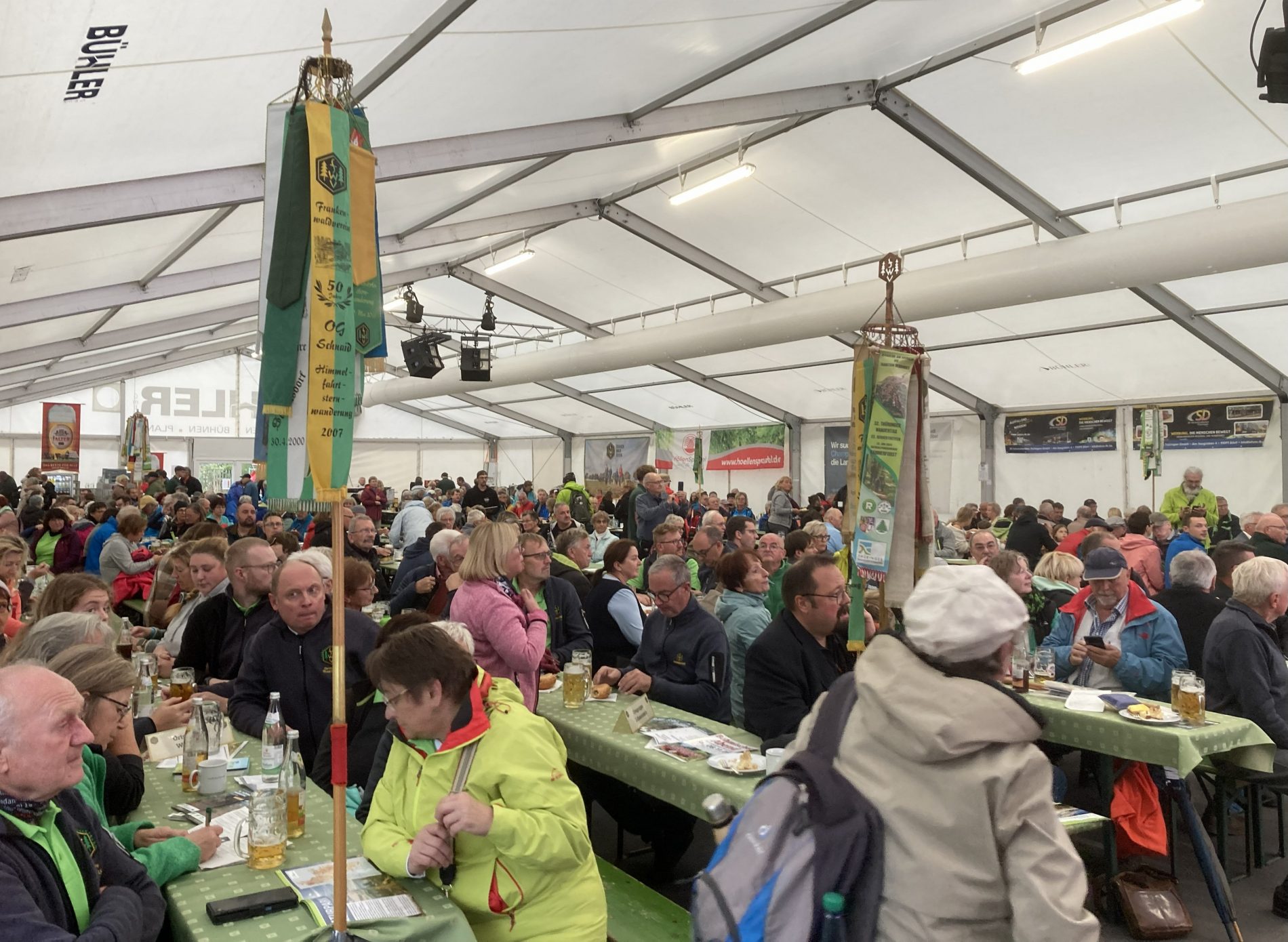 Gut, dass der Frankenwaldverein das große Festzelt für die Wanderfreunde nutzen konnte, denn schon beim Start der Wandergruppen fing es zu nieseln an, graue Wolken zogen auf. Zur Auswahl standen 14 Touren mit verschiedenen Streckenlängen und Schwierigkeitsgraden rund um Mödlareuth und auf dem Grünen Band. Der teilweise erforderliche Bustransfer zu den Startpunkten erwies sich als zeitliches Problem, um auch pünktlich zur Eröffnung der traditionellen Festveranstaltung am Nachmittag wieder am Festplatz anzukommen. Die rückkehrenden Wanderfreunde waren froh darüber, sich im beheizten Festzelt aufwärmen zu können. Weniger das regnerische Wetter war für sie ausschlaggebend, sondern vielmehr die zahlreichen neuen Wander-, Kultur- und Naturerlebnisse unterwegs. Man traf Wanderfreunde und lernte wieder ein Stück unserer schönen deutschen Heimat kennen.